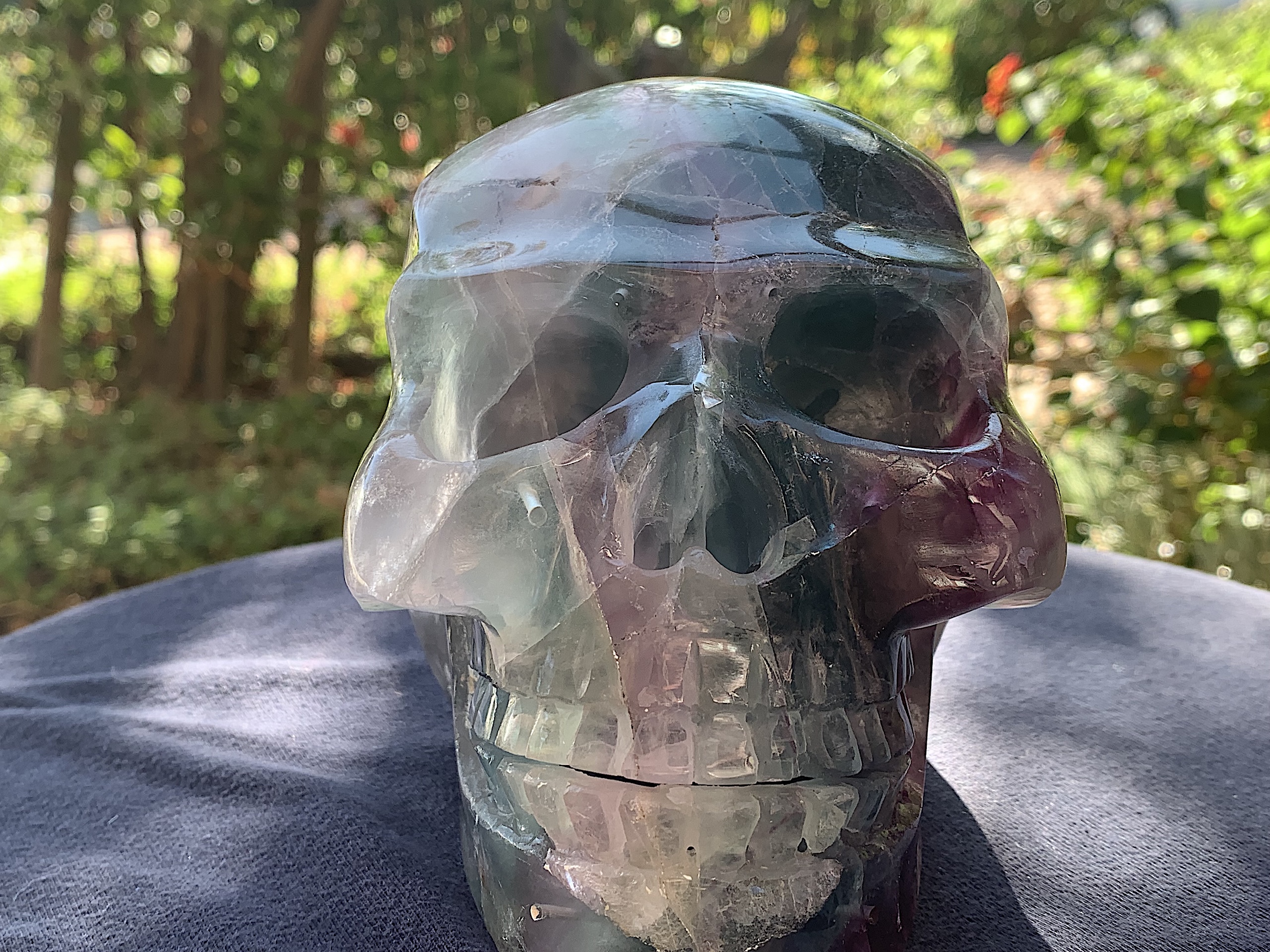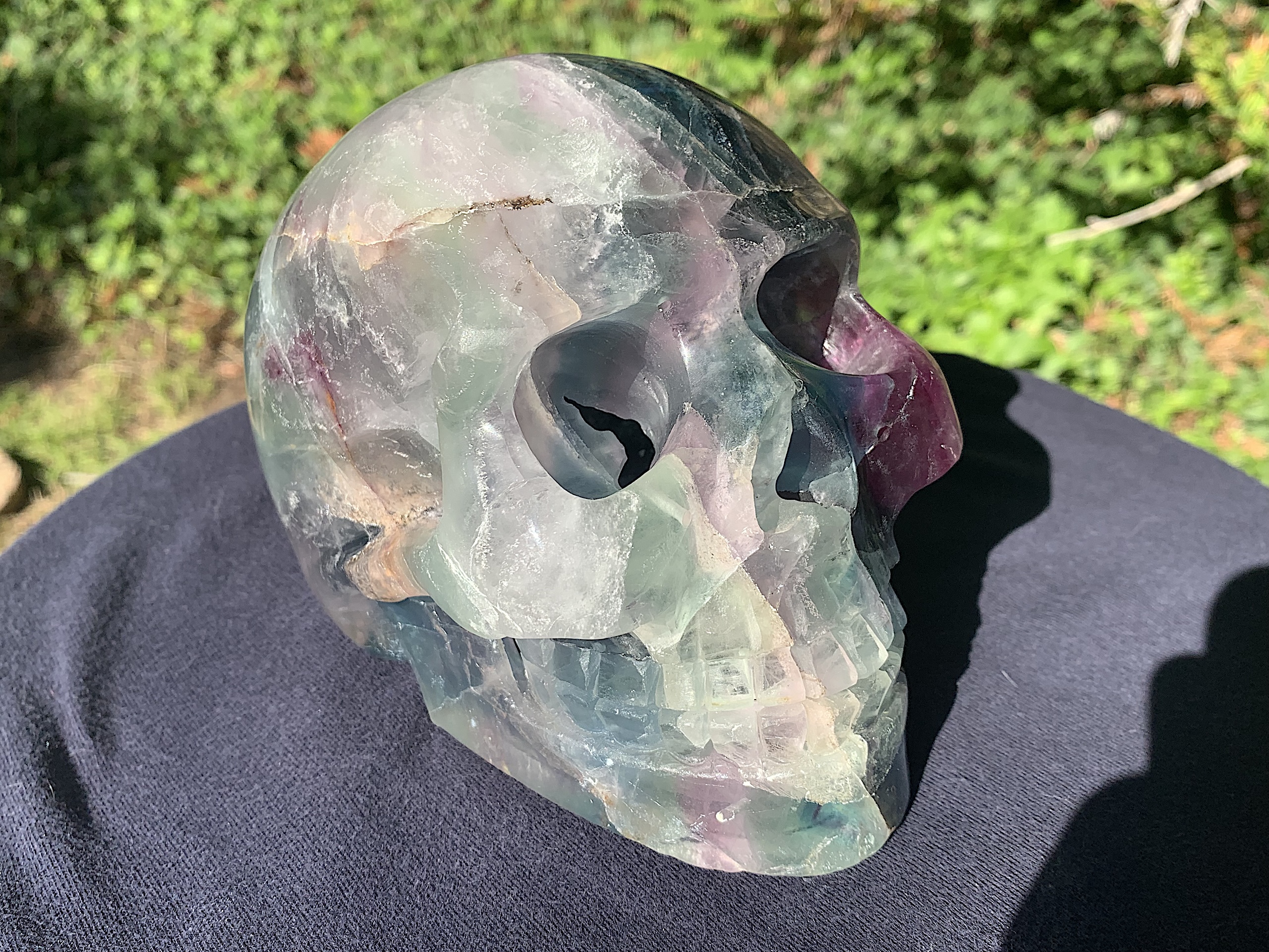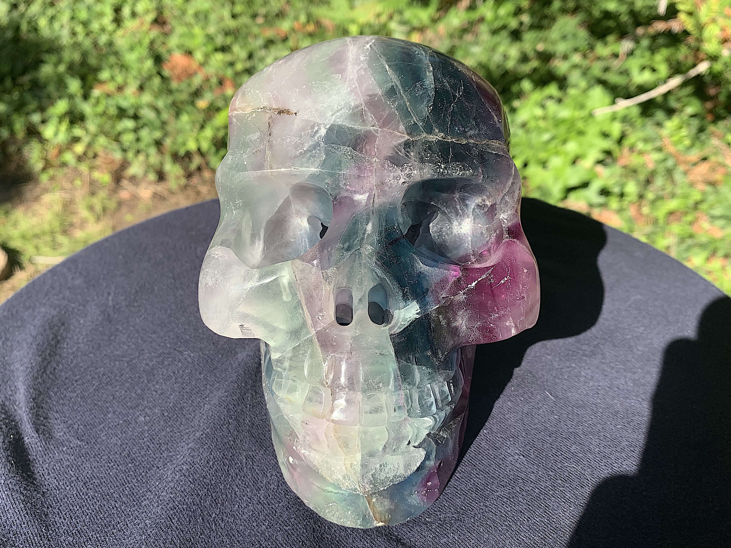 Wow! This is a very large Fluorite Crystal Skull. The colors are diverse, vibrant, and inviting and those cheek bones are to die for. A wonderful piece for any collection.