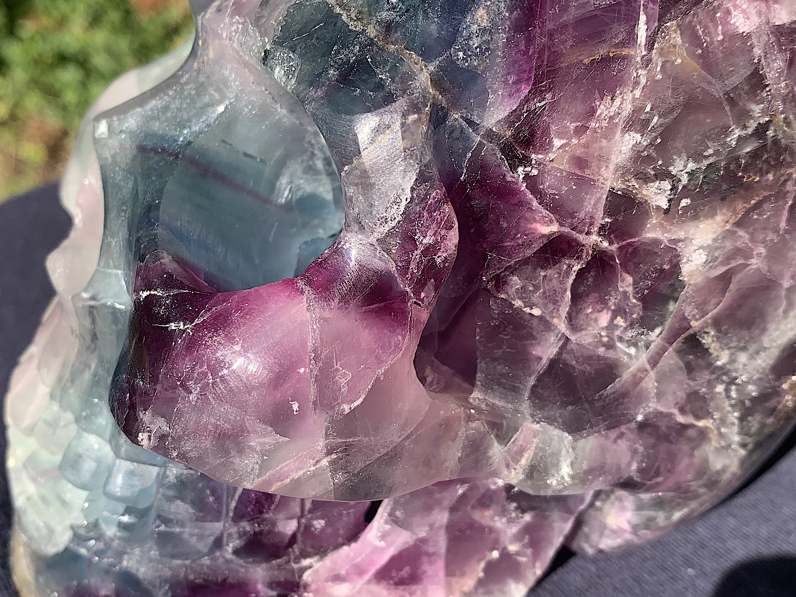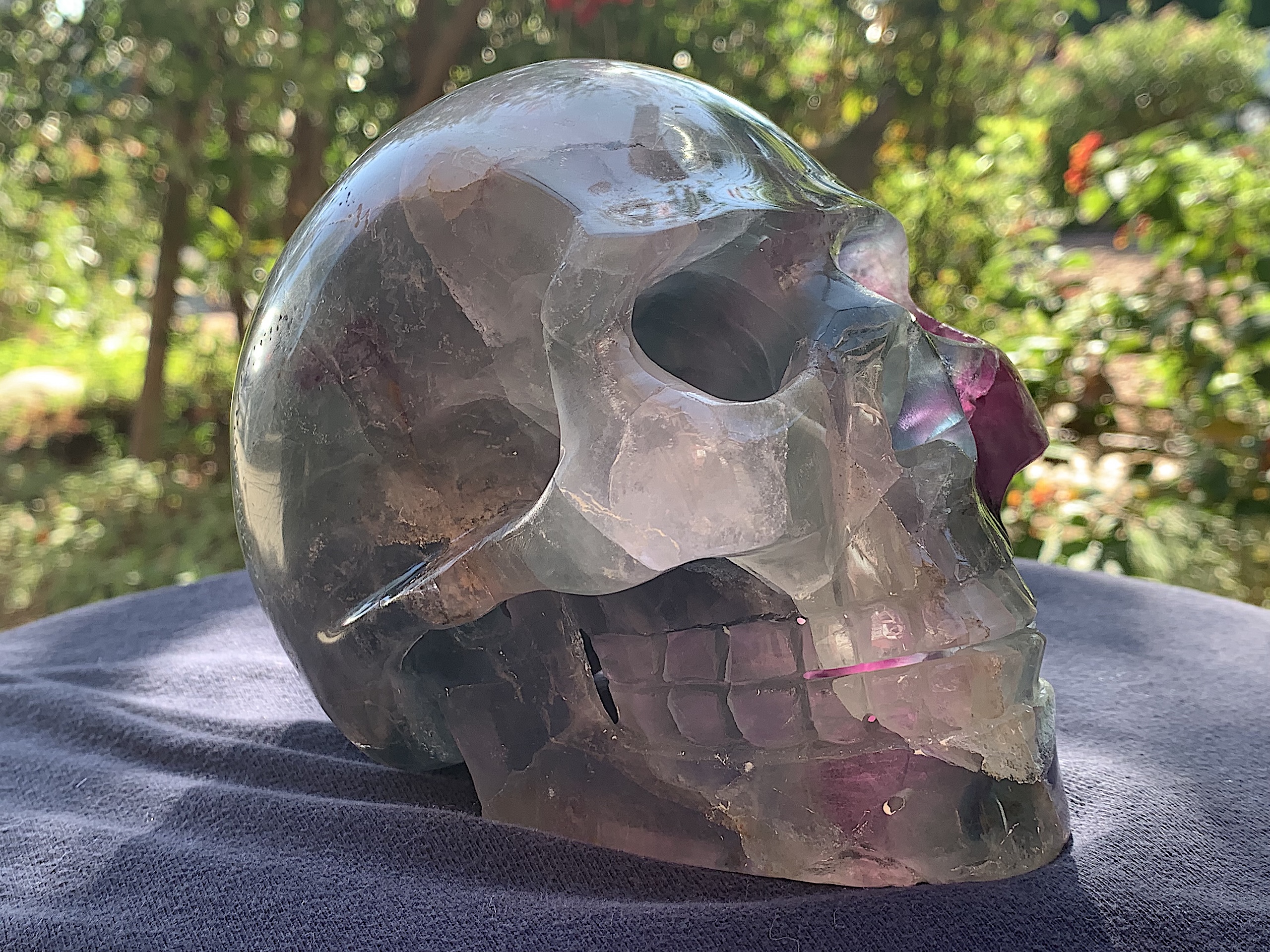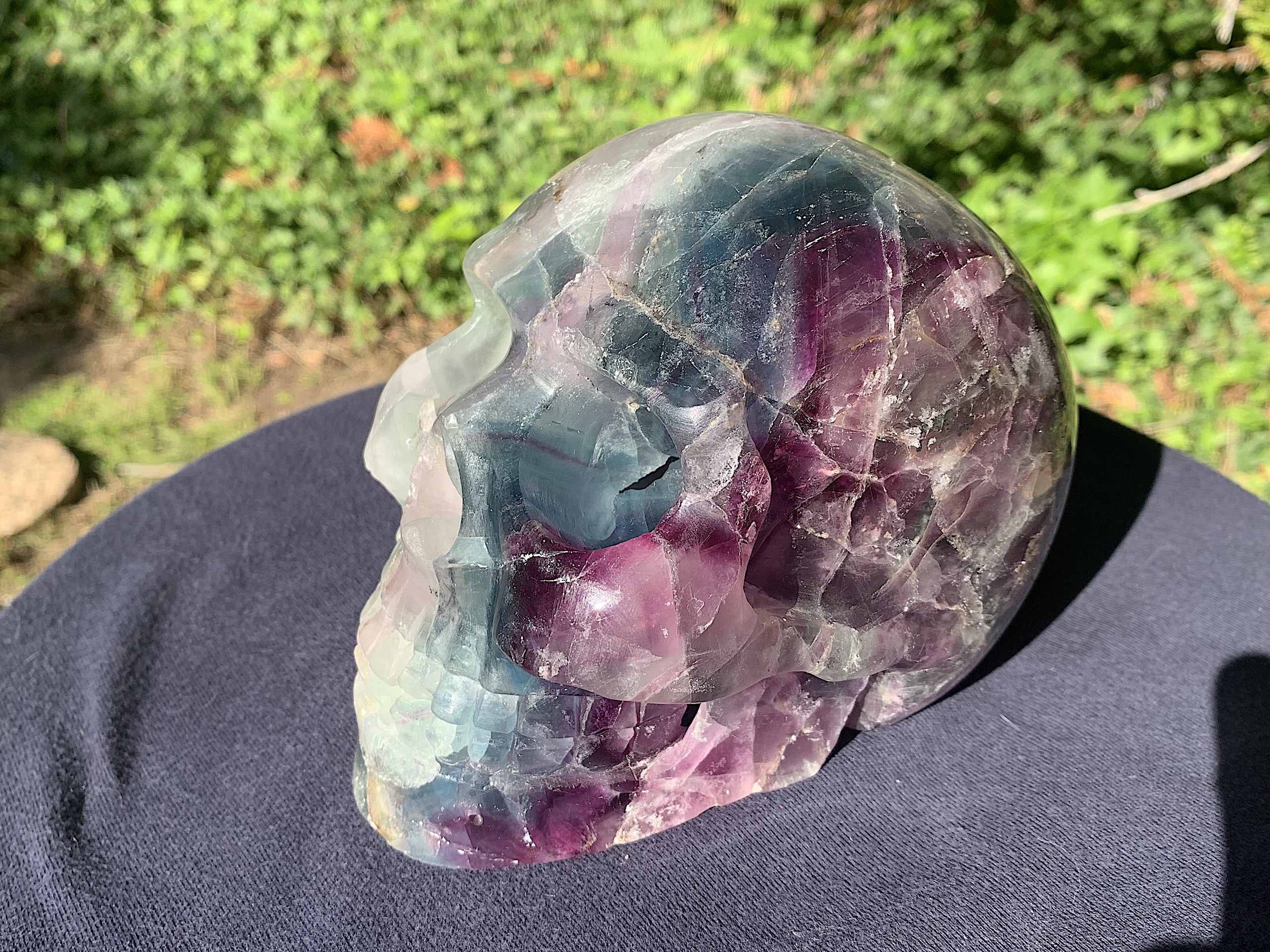 Wow! This is a very large Fluorite Crystal Skull. The colors are diverse, vibrant, and inviting and those cheek bones are to die for. A wonderful piece for any collection.