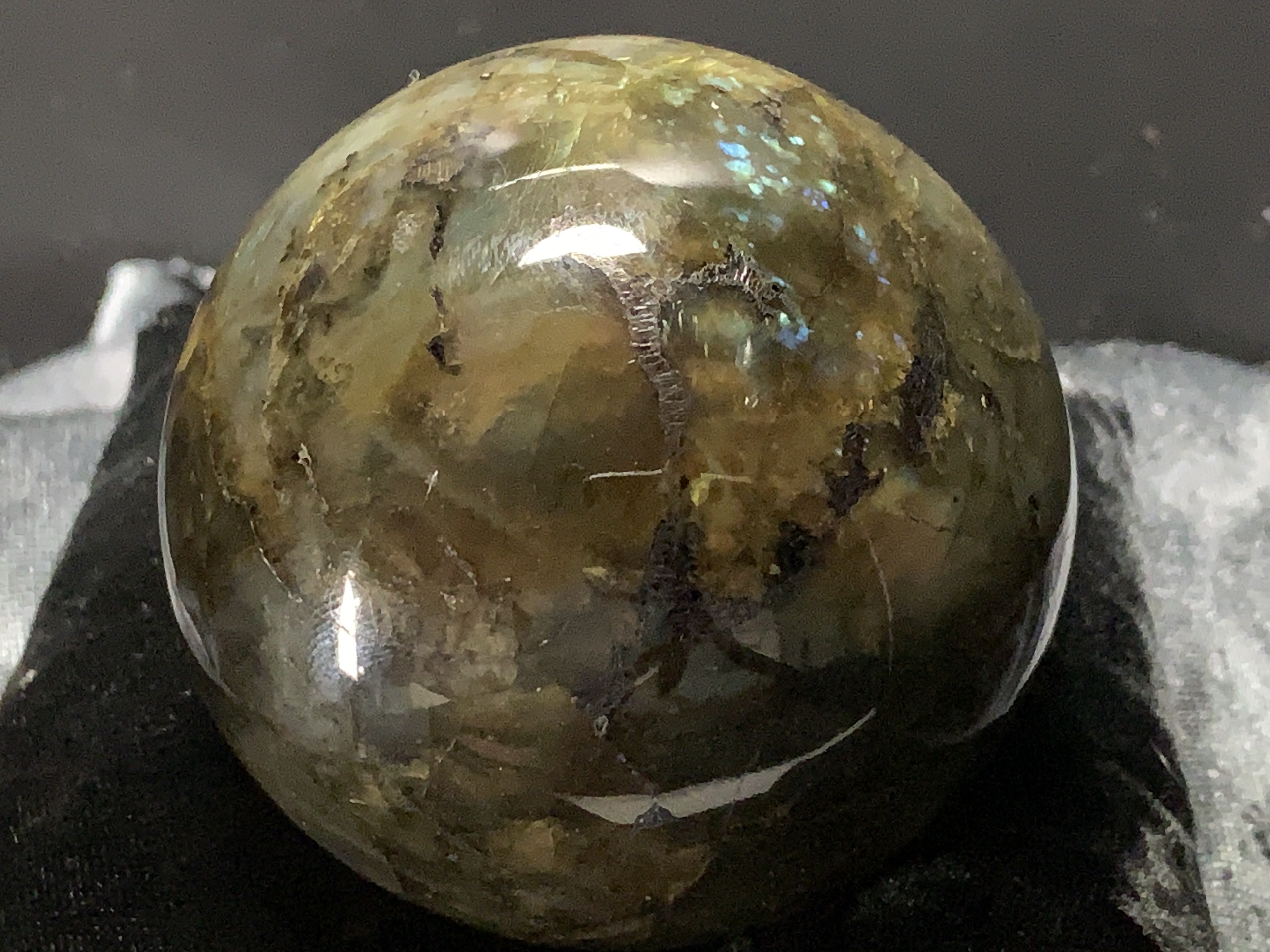 This is a very nice Labradorite Sphere from Madagascar with beautiful blue and gold chatoyancy. In some areas of the sphere, this shows as bright speckles and looks very attractive. This sphere is much nicer than photos show. Labradorite is an enormously helpful tool in reconnecting with your roots of origin, whether they be angelic in source or from another star system. This stone is considered essential in body work.
