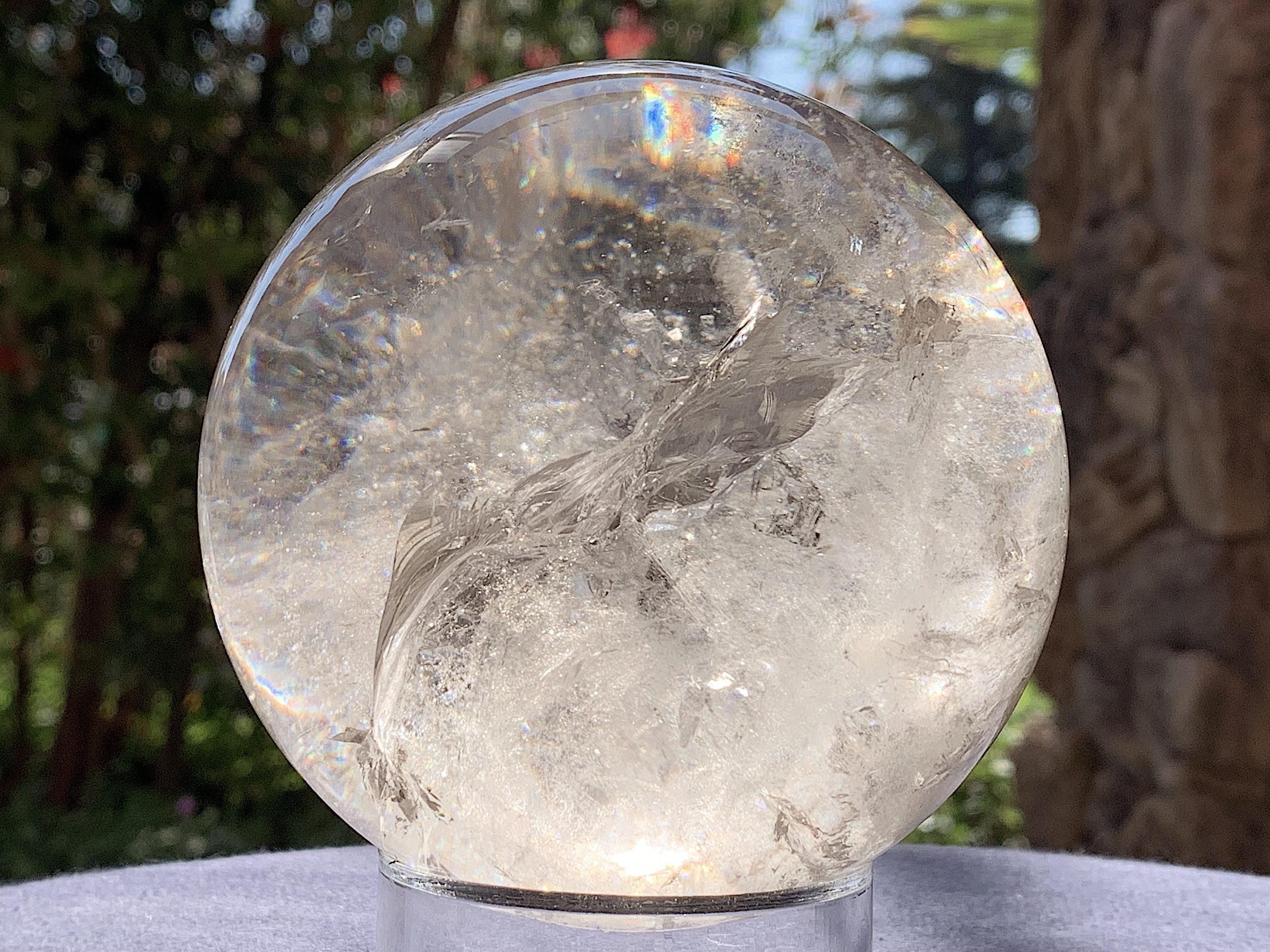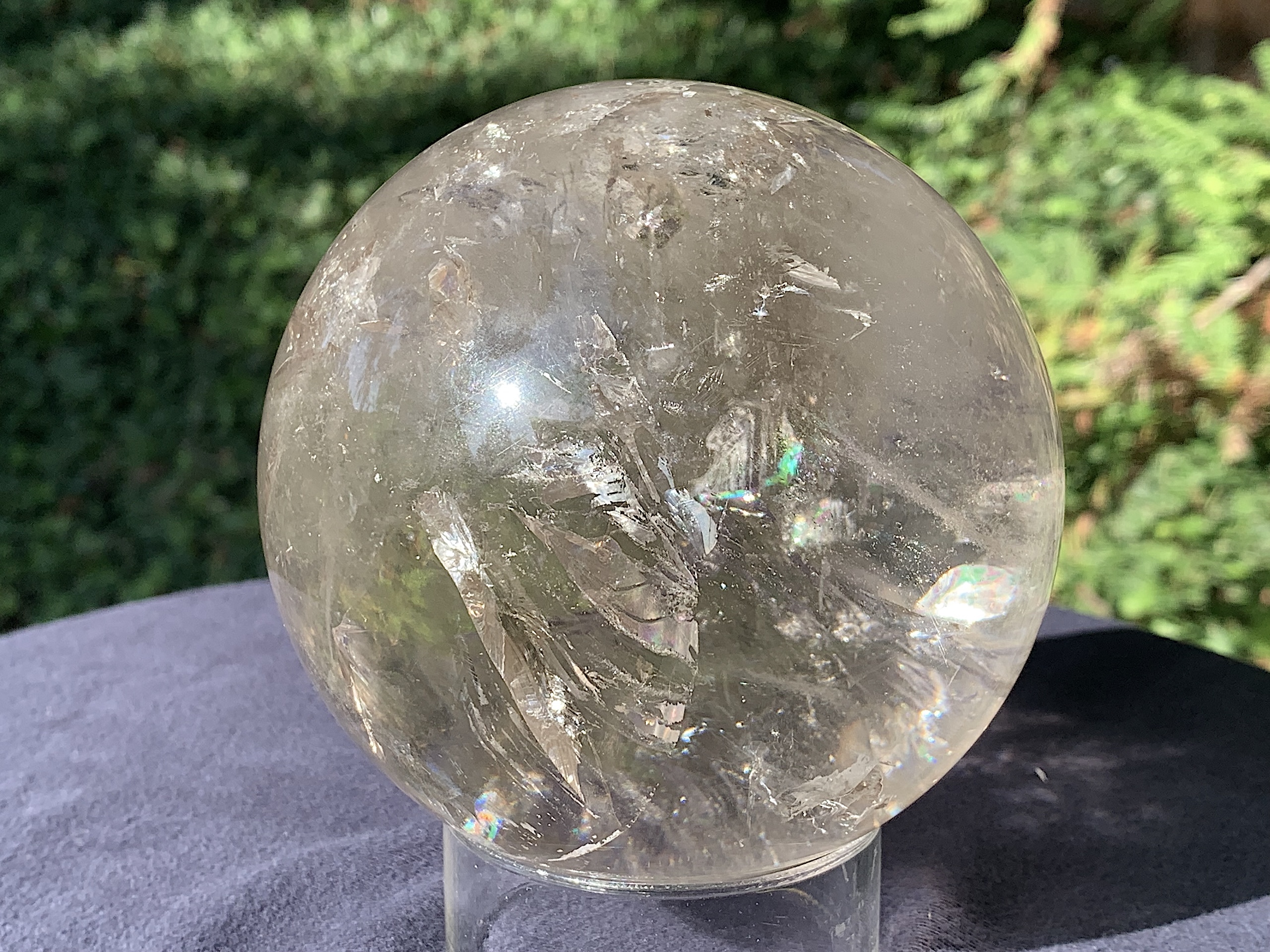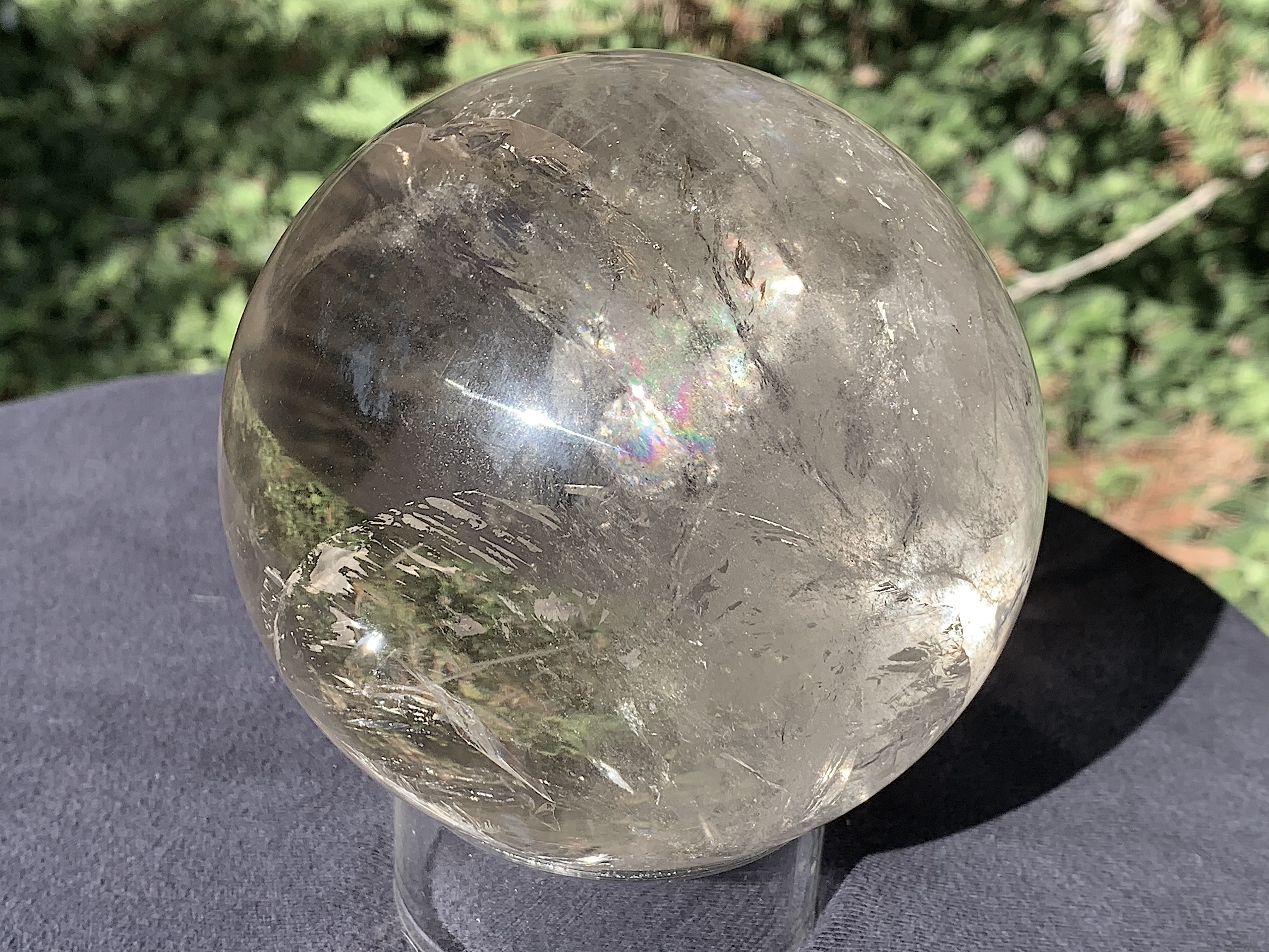 This is a lovely Light Smoky Phantom Rainbow Quartz Sphere. You can see the brown phantoms in the photos. This sphere has good clarity, pretty rainbows, and silvery veils. There is a small point still attached that was mostly polished off. Very nice.