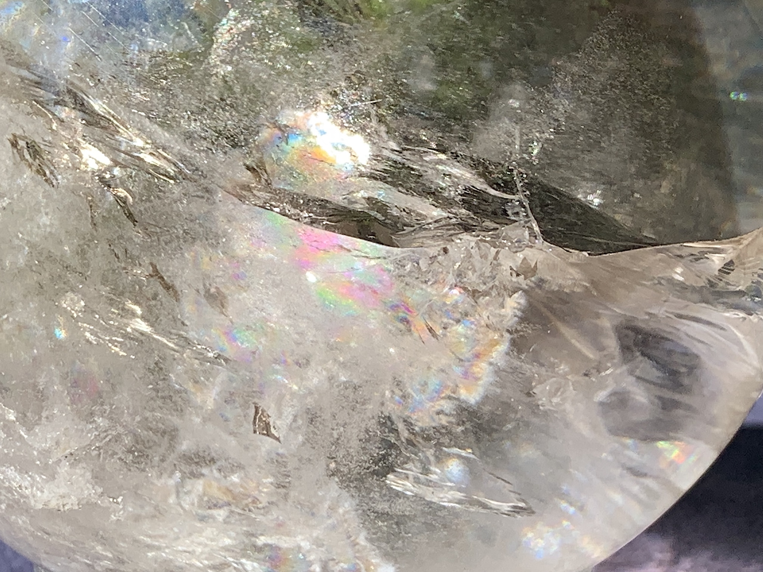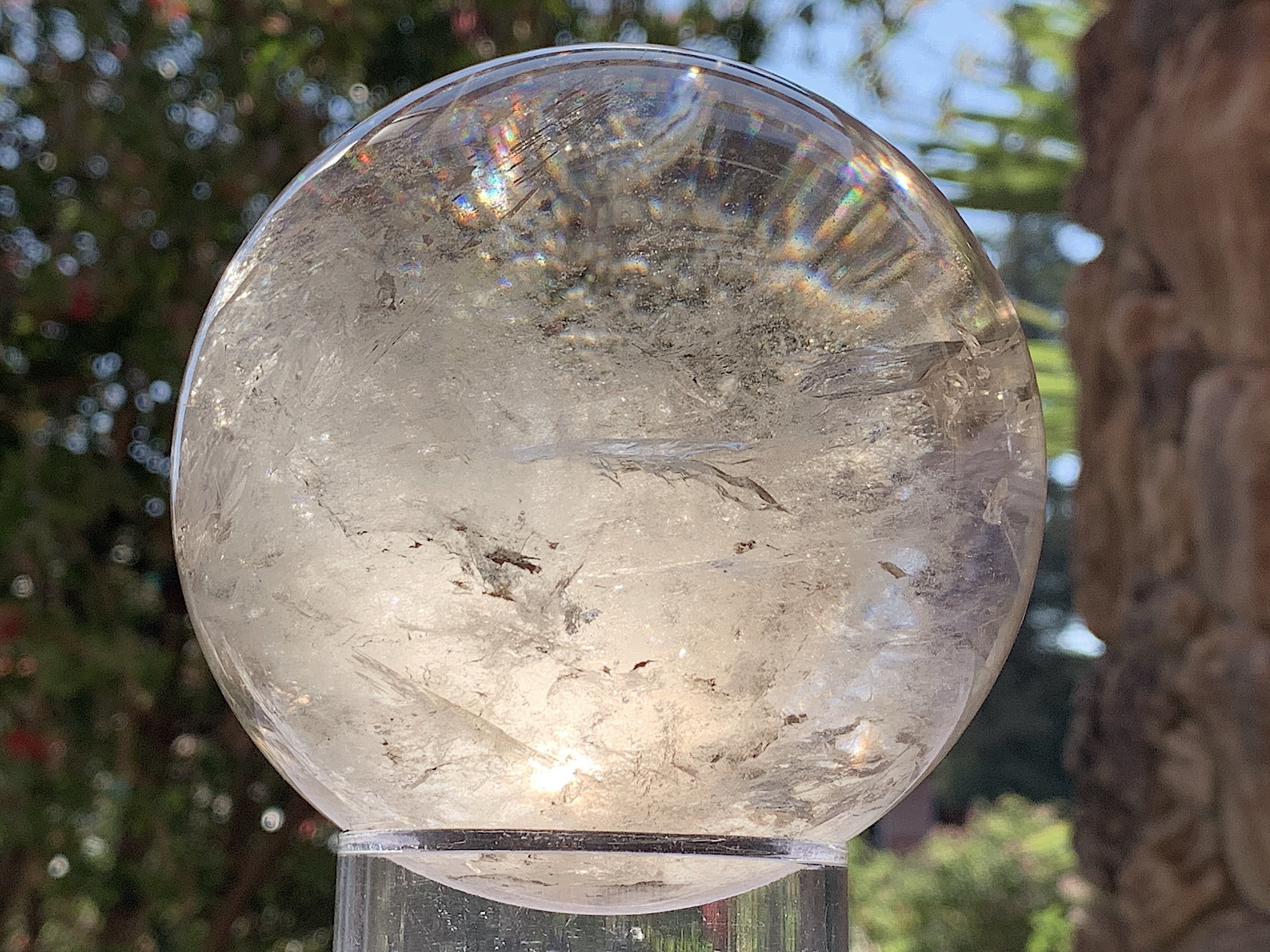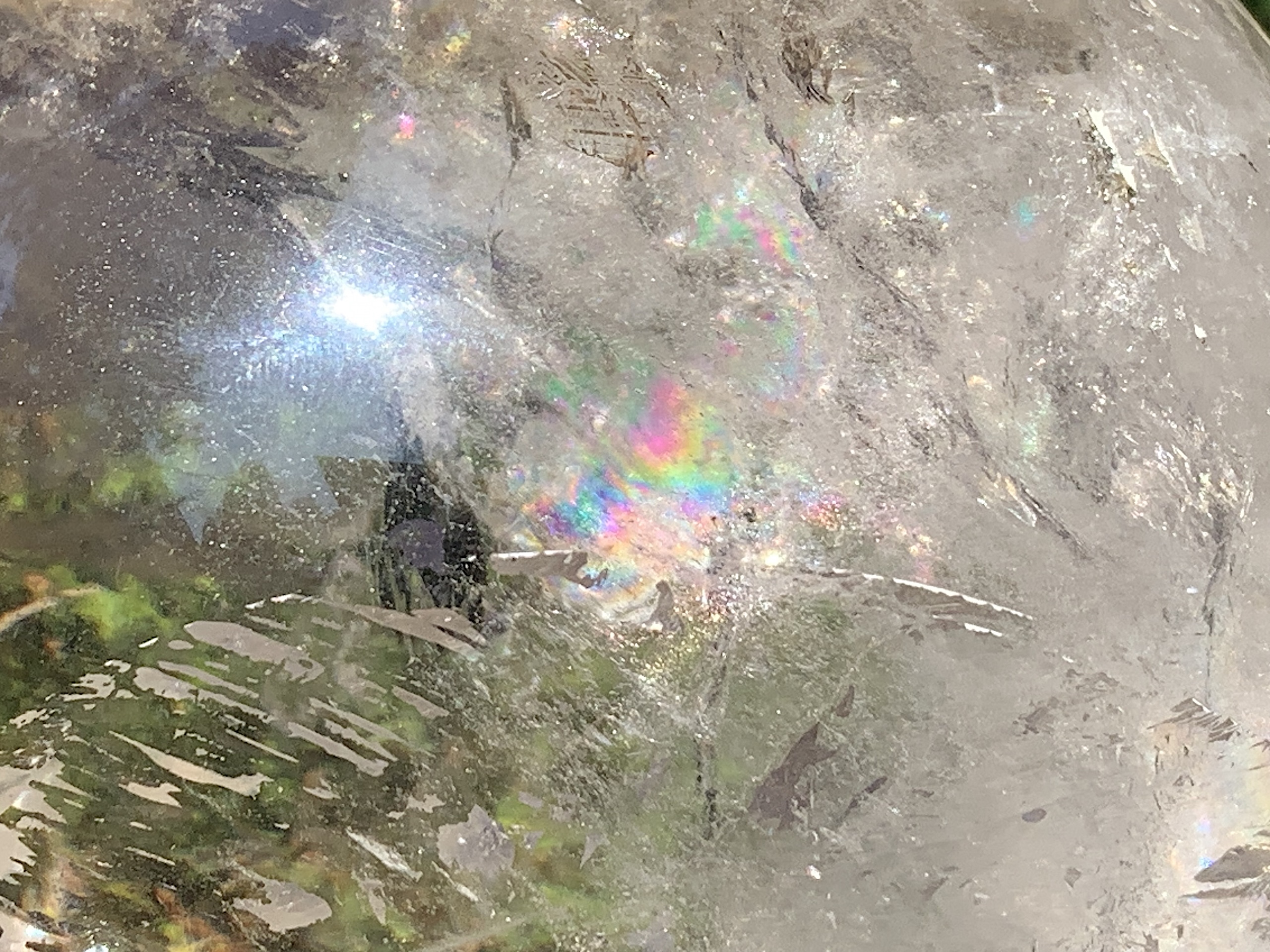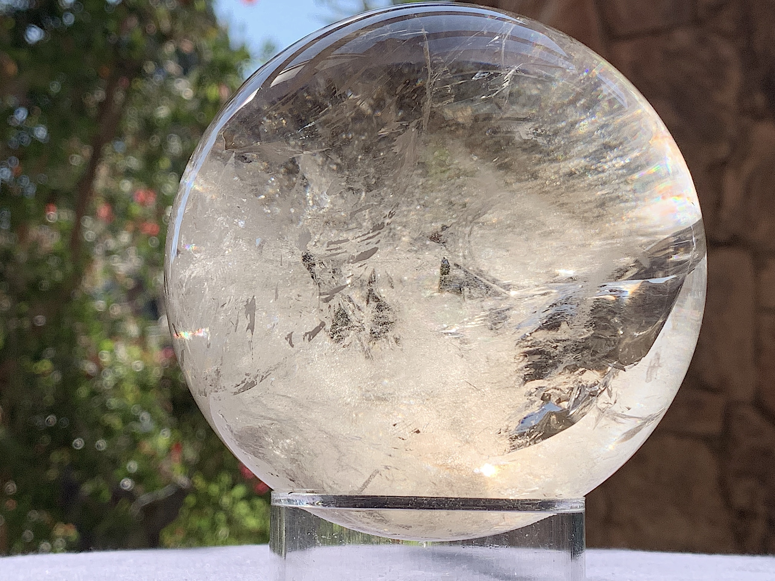 This is a lovely Light Smoky Phantom Rainbow Quartz Sphere. You can see the brown phantoms in the photos. This sphere has good clarity, pretty rainbows, and silvery veils. There is a small point still attached that was mostly polished off. Very nice.