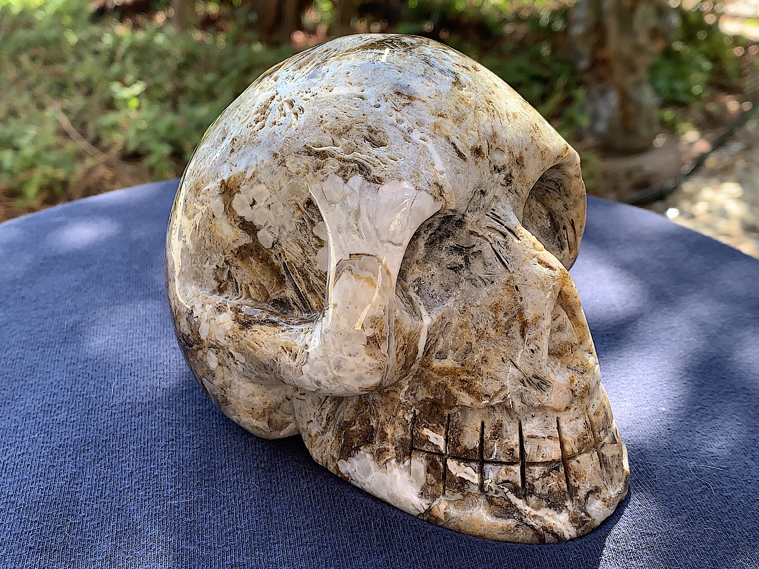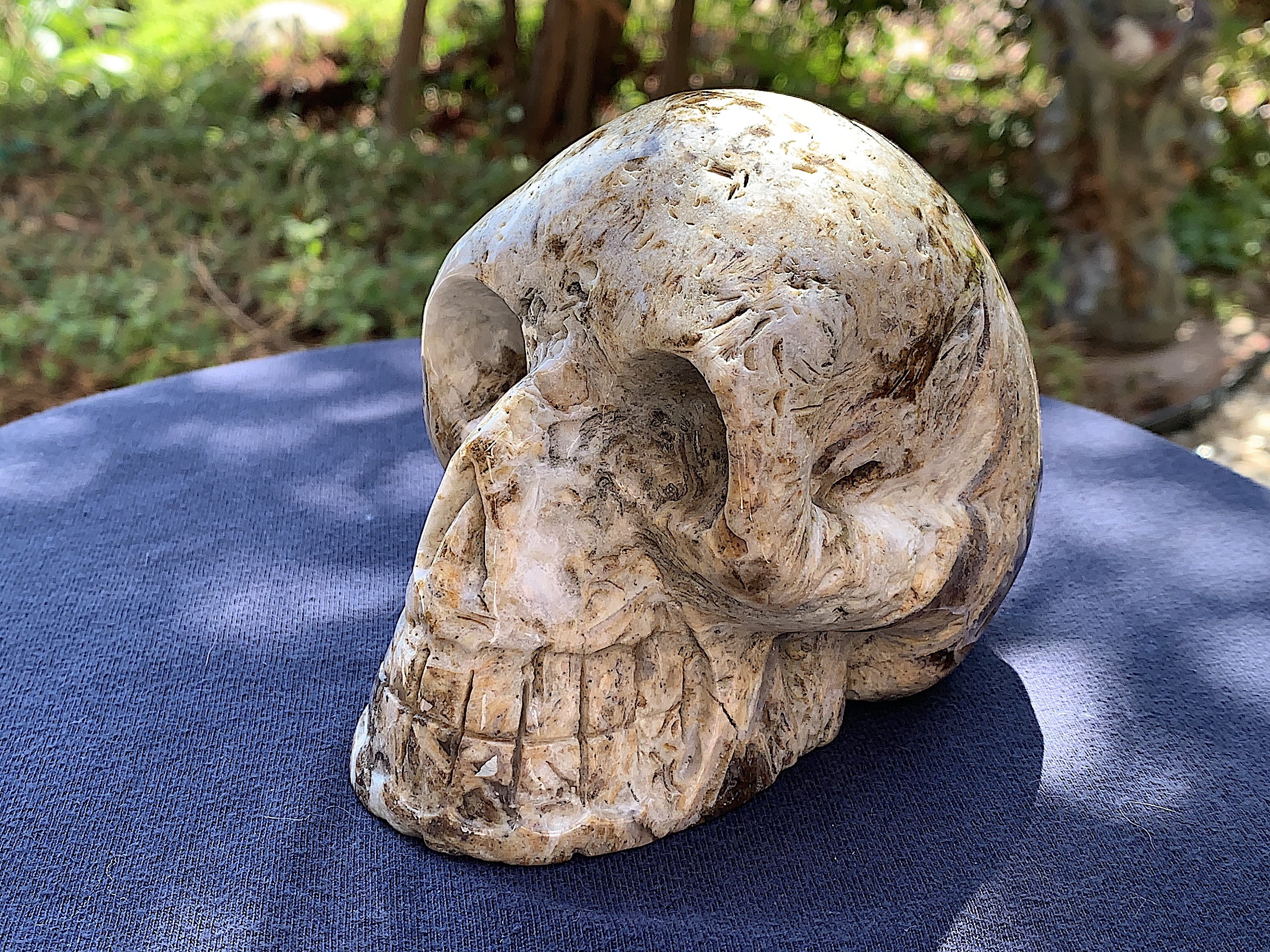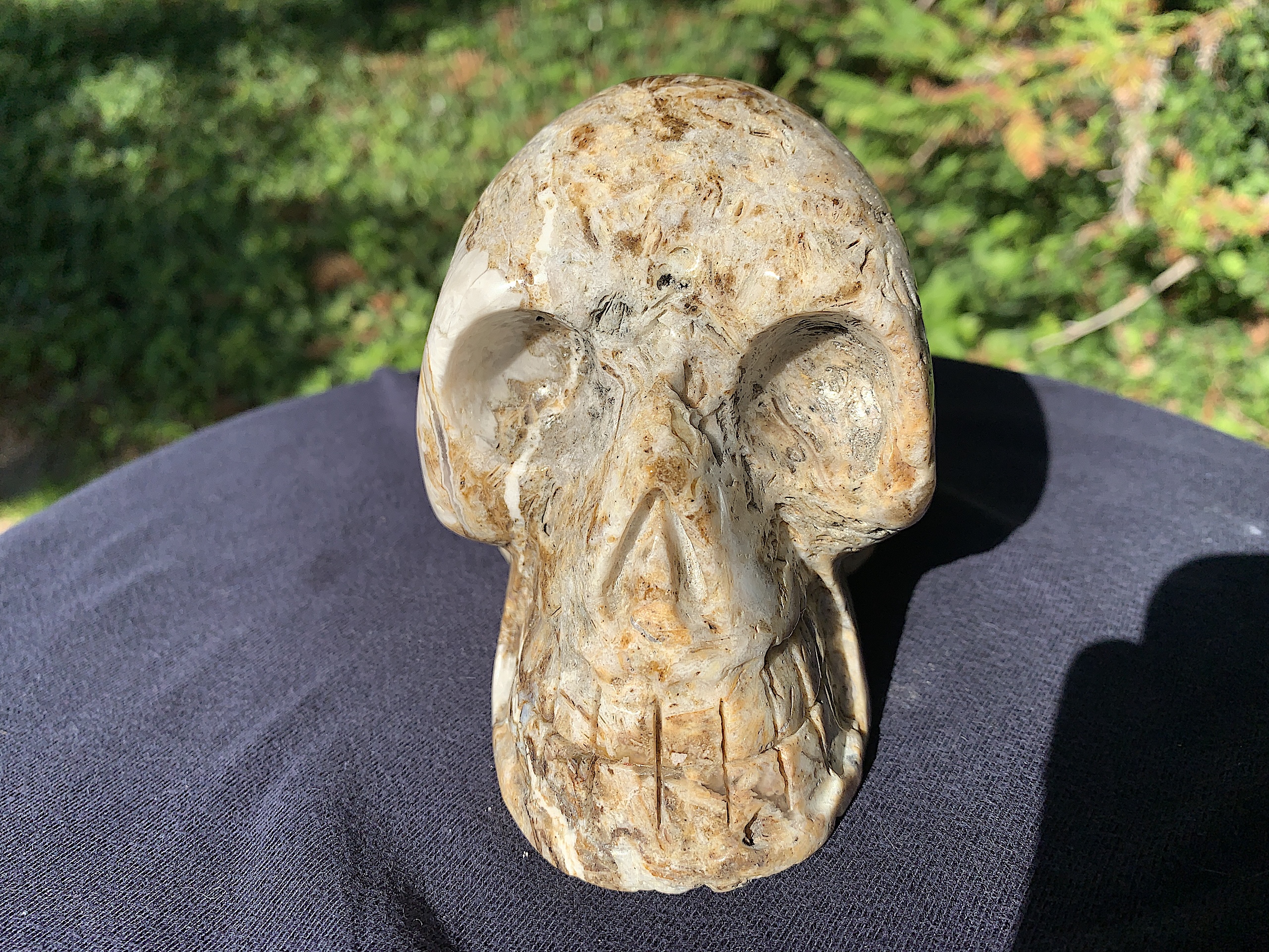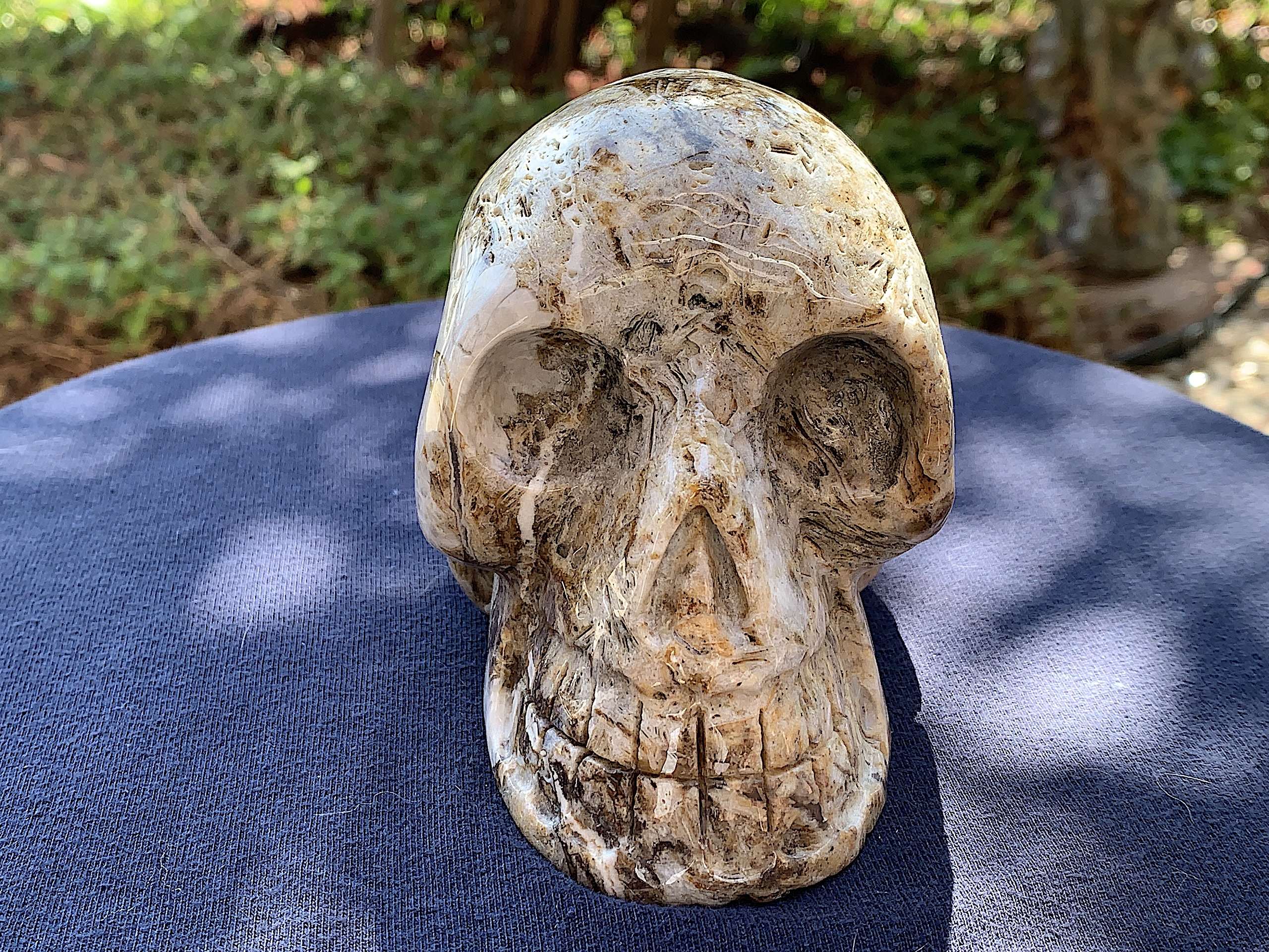 This lovely Tree Leaves Agate Crystal Skull has really nice patterns and appeal. Its marbled surface resembles Petrified wood.