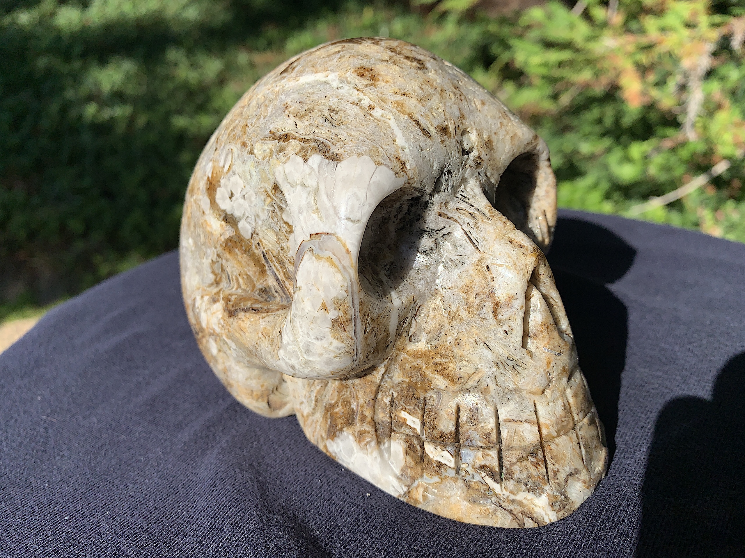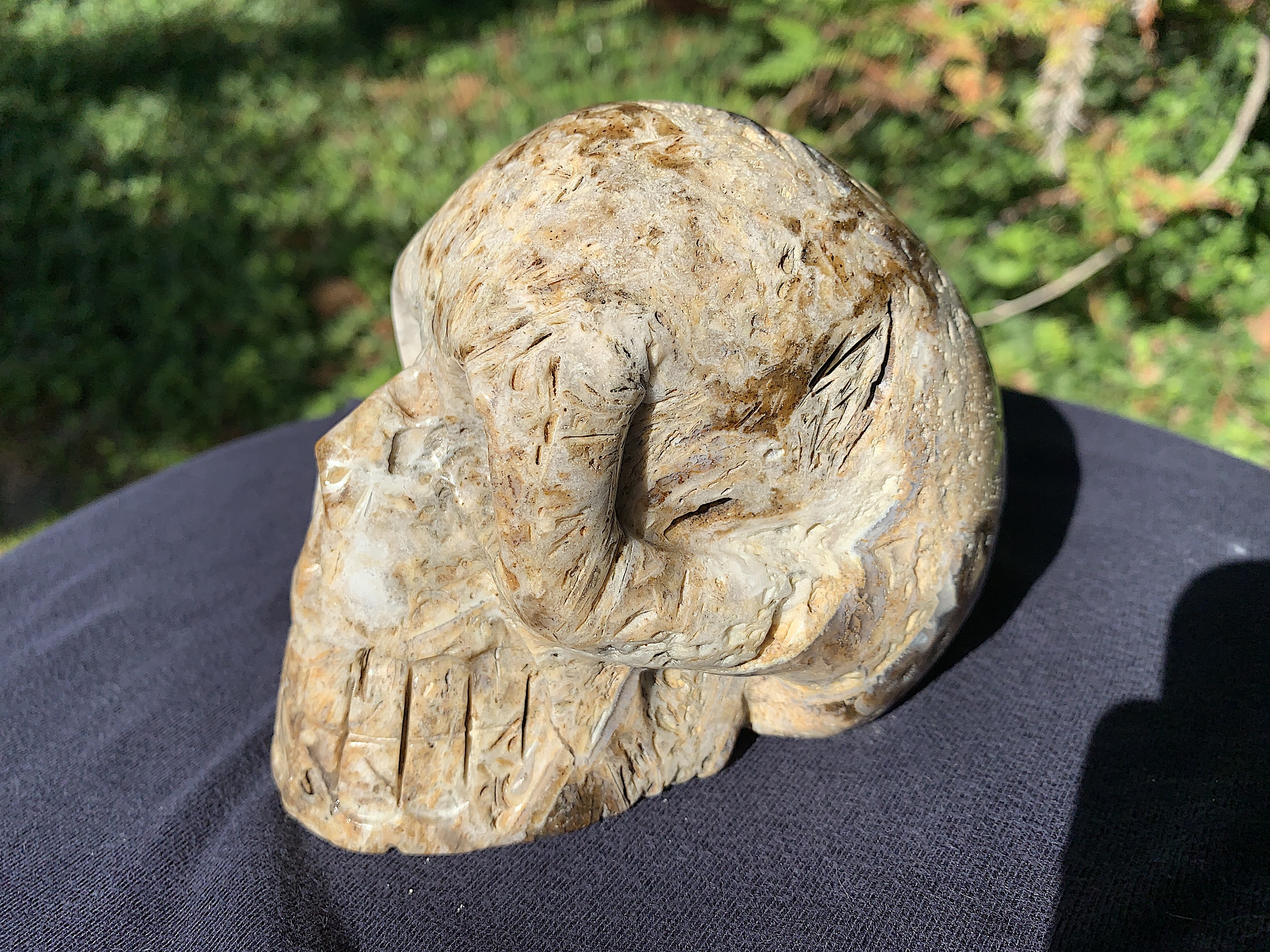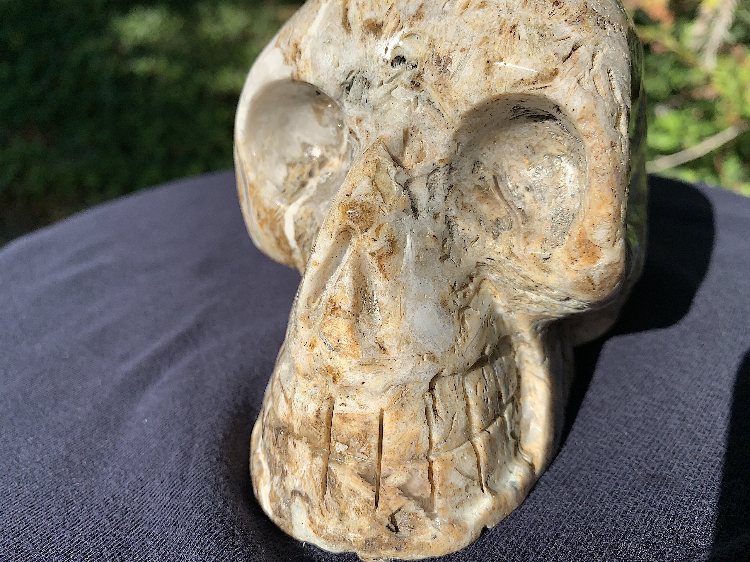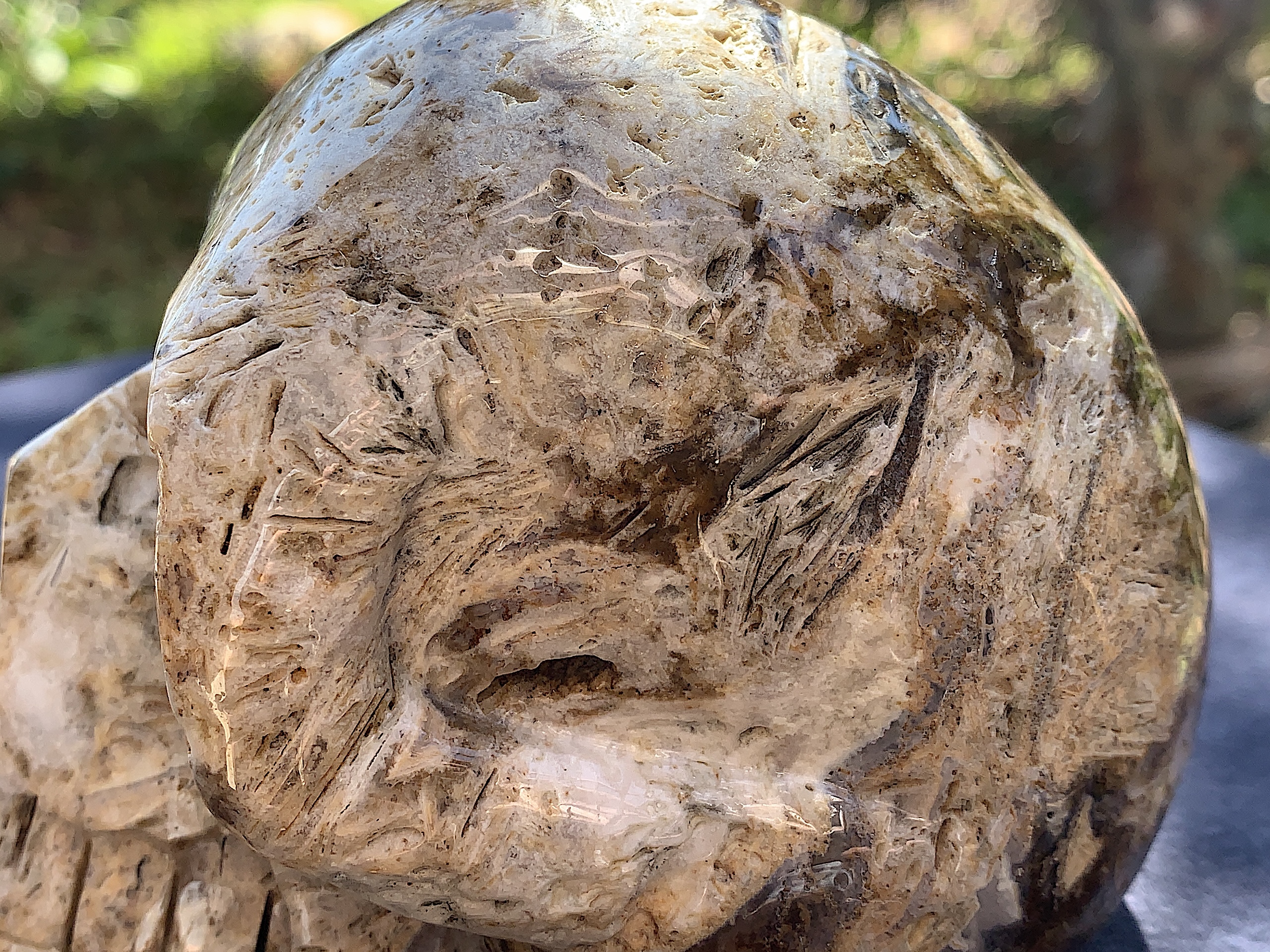 This lovely Tree Leaves Agate Crystal Skull has really nice patterns and appeal. Its marbled surface resembles Petrified wood.