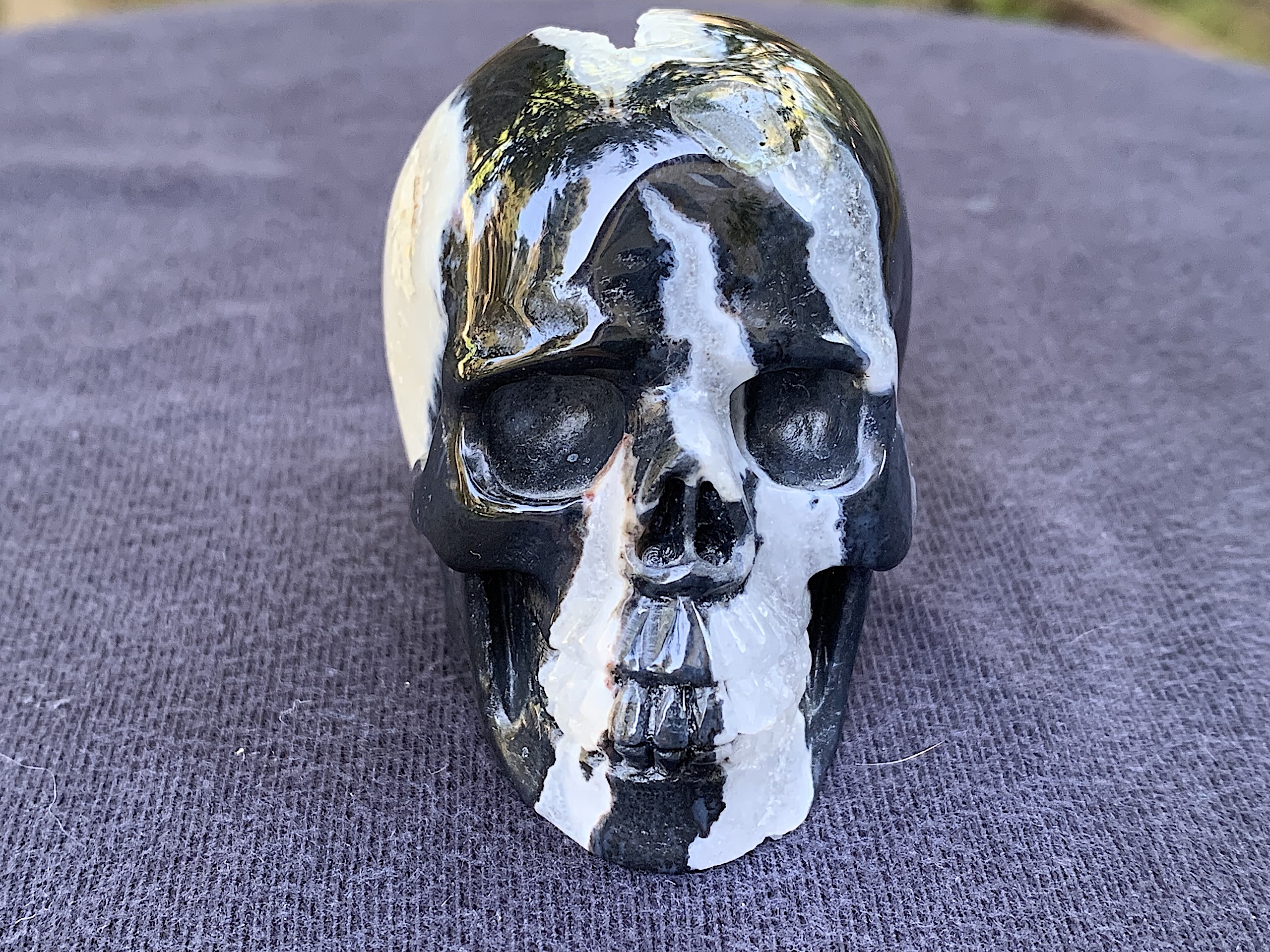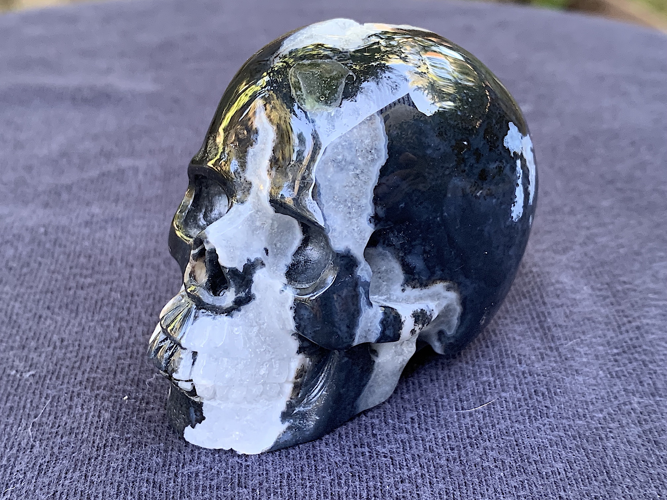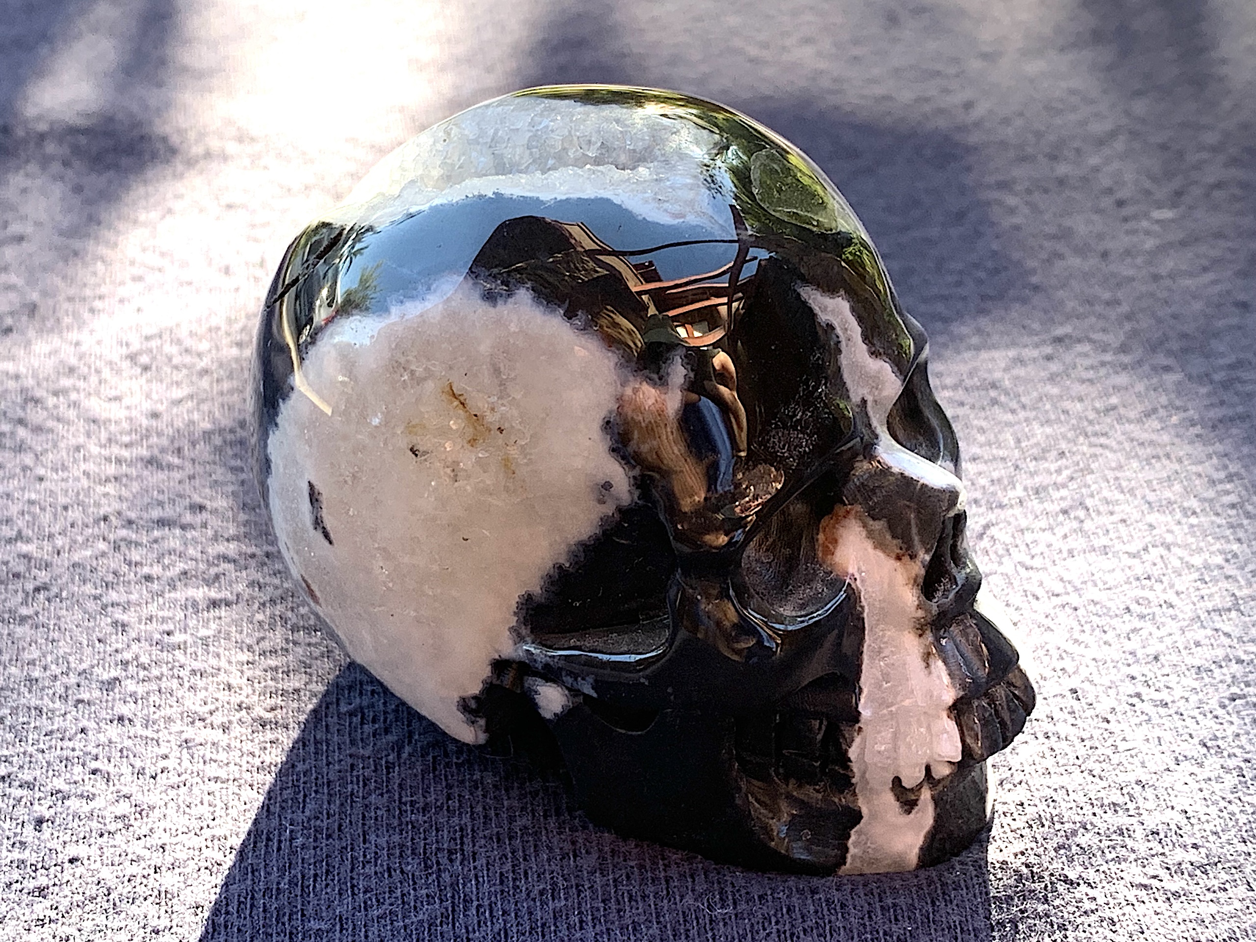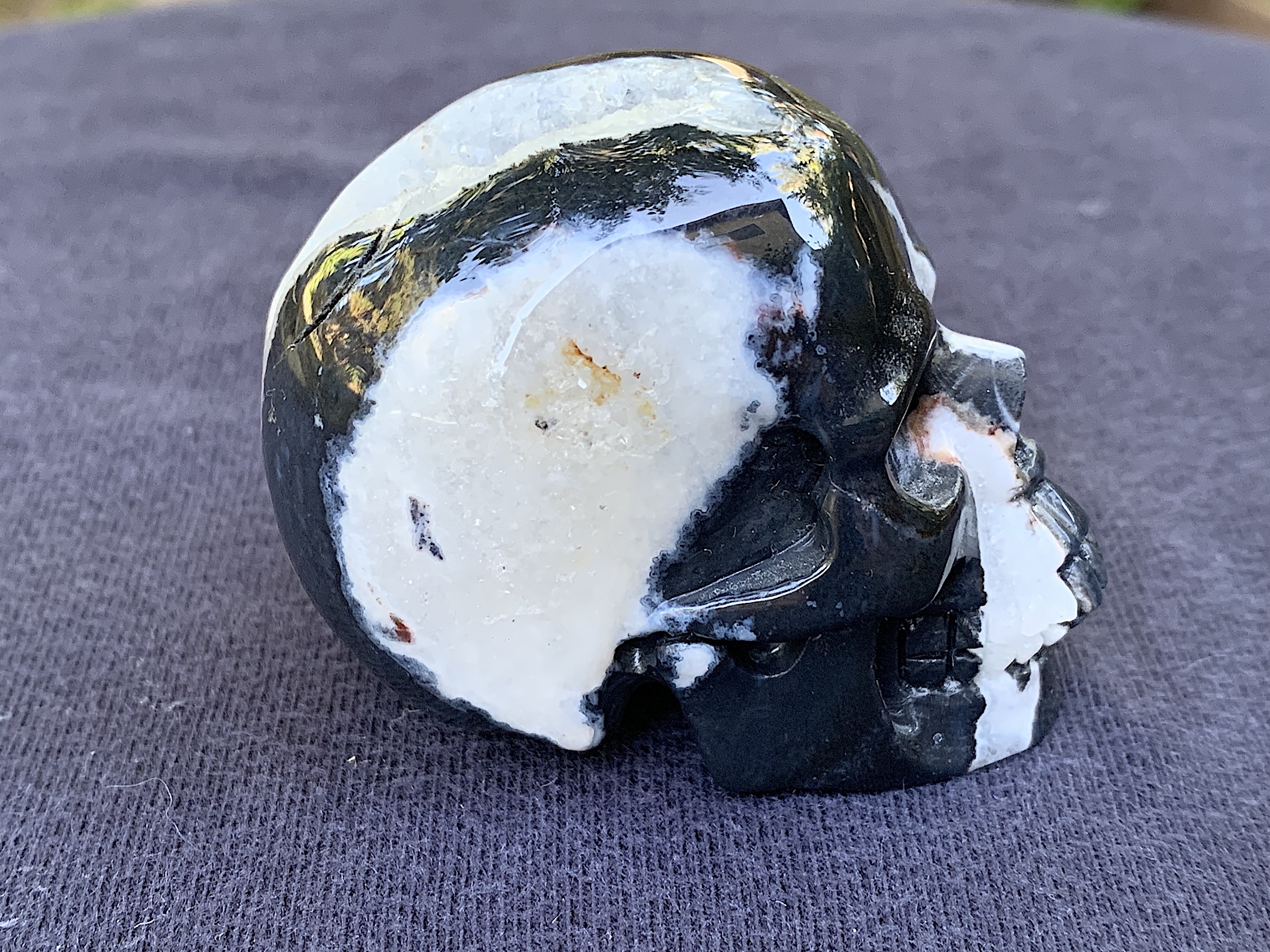 This Zebra Agate Geode Crystal Skull is so adorable. If you love Zebra Agate, this one will not disappoint. The geode on top of the head is very whimsical.