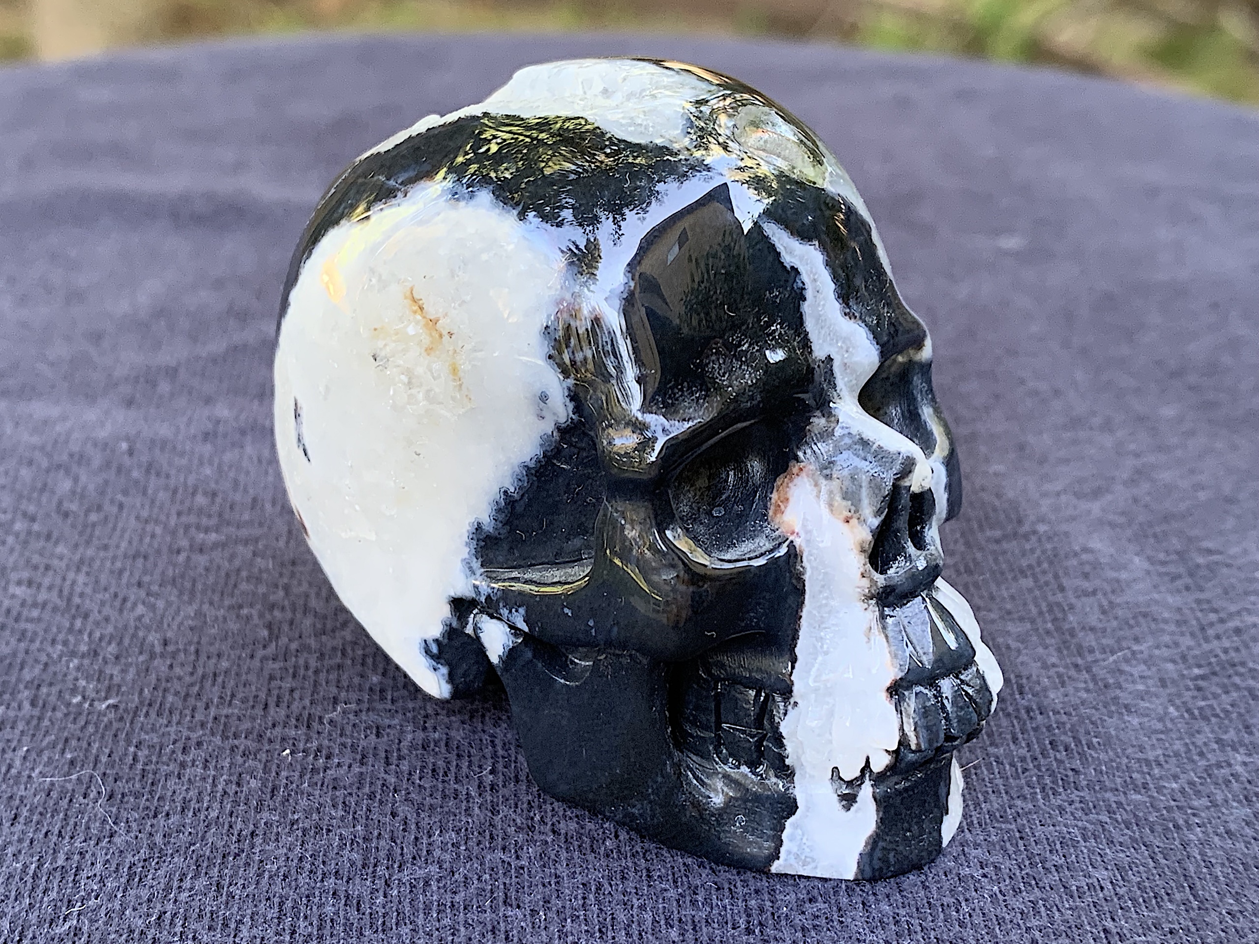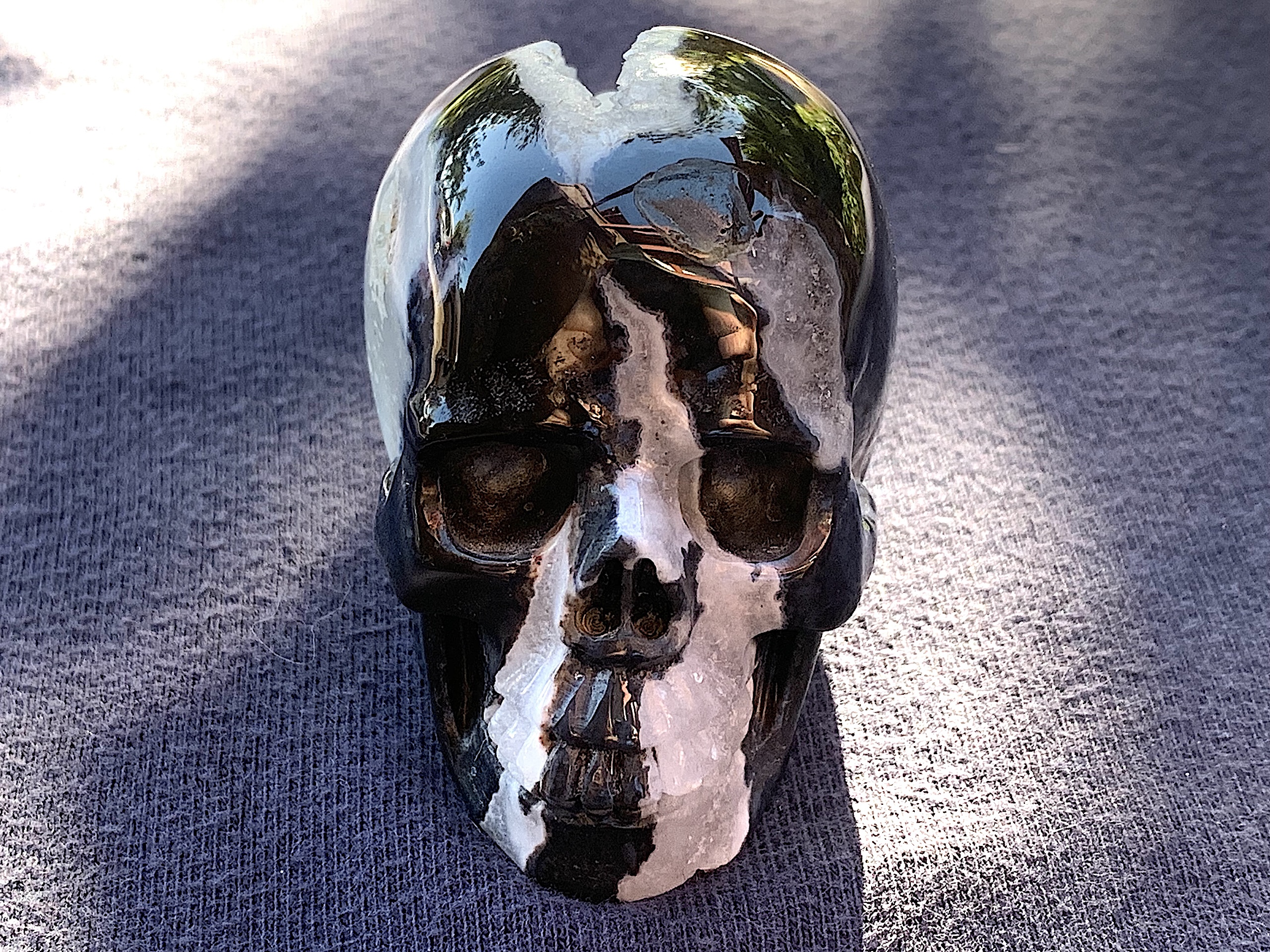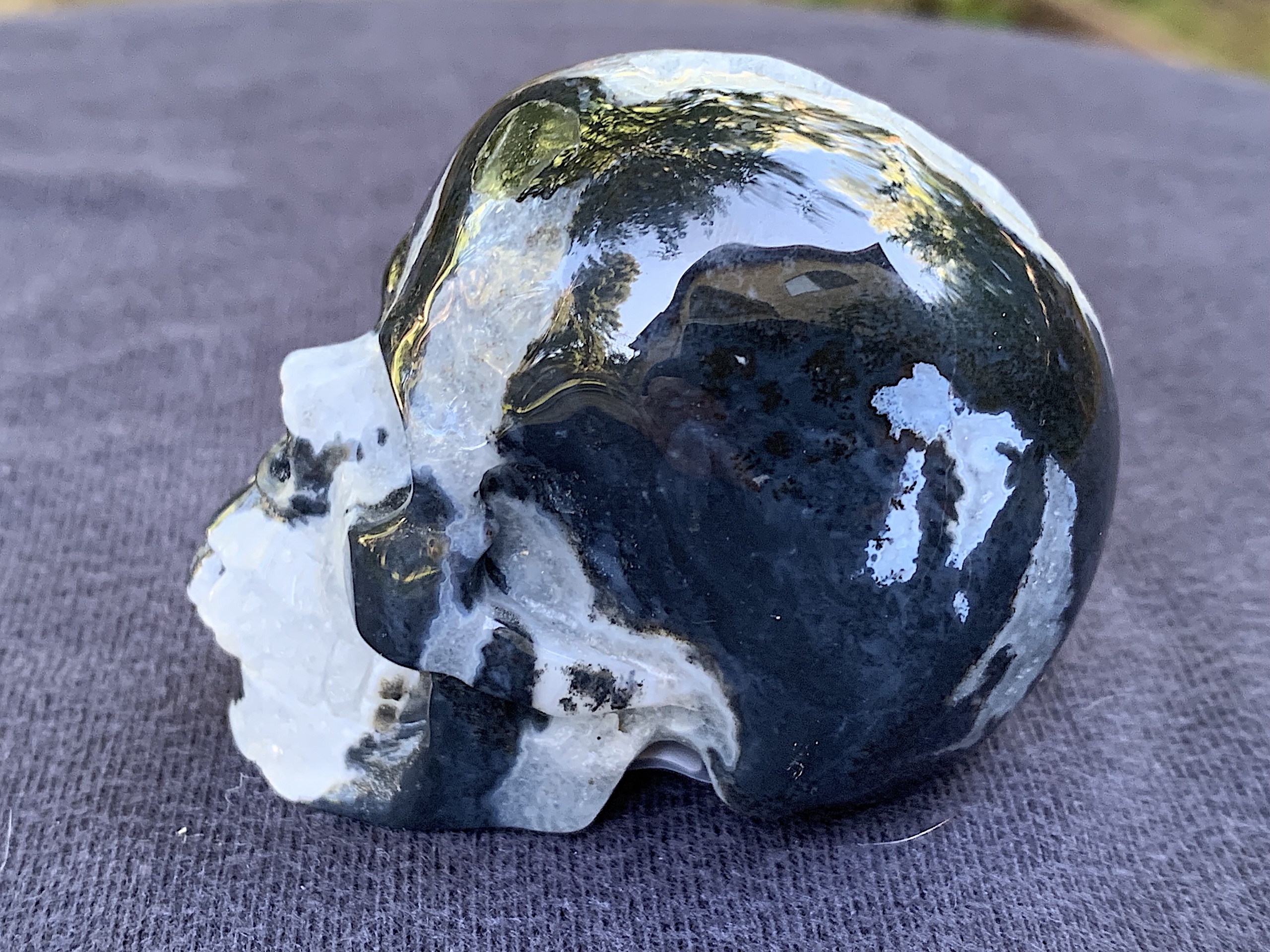 This Zebra Agate Geode Crystal Skull is so adorable. If you love Zebra Agate, this one will not disappoint. The geode on top of the head is very whimsical.