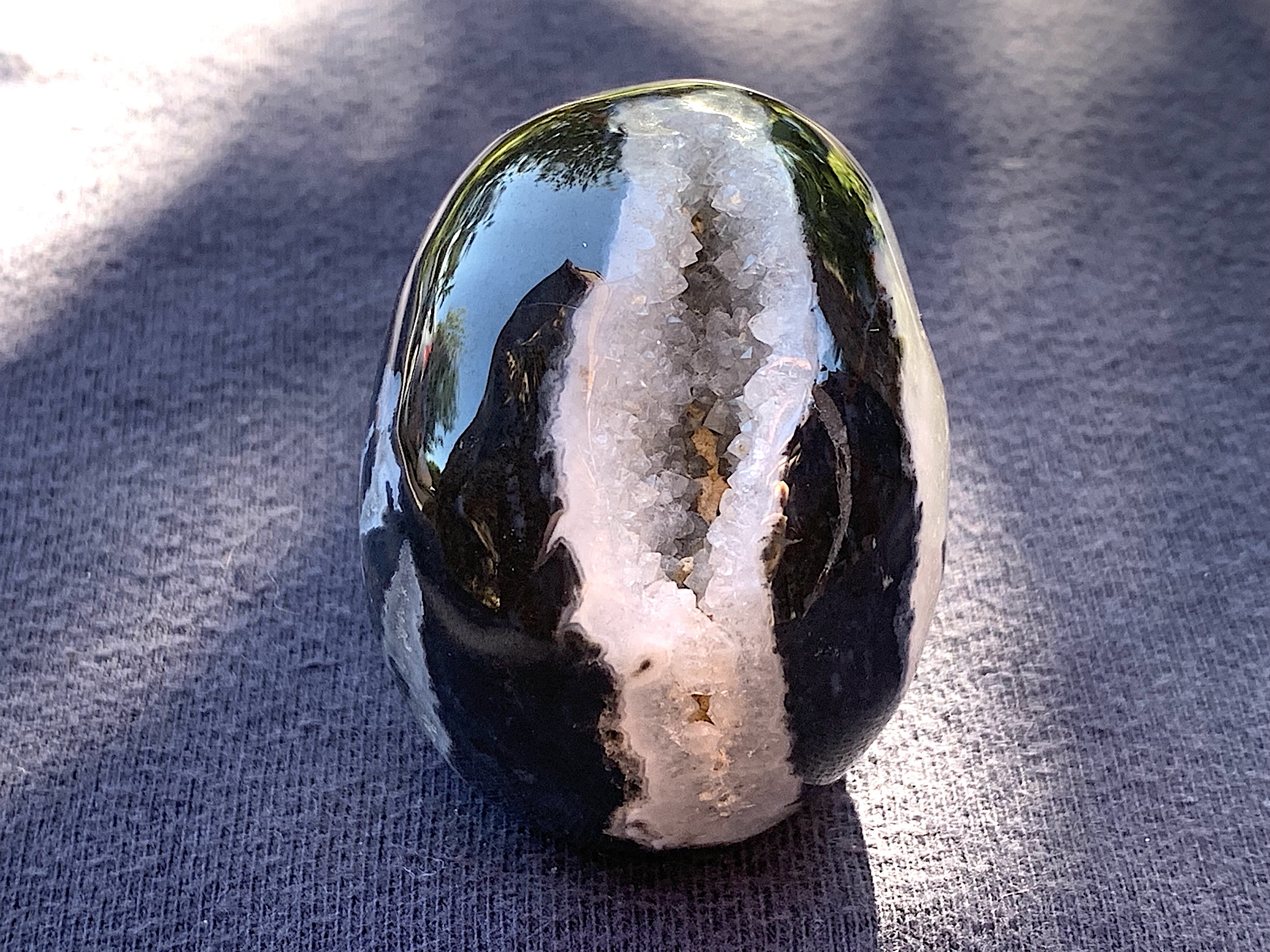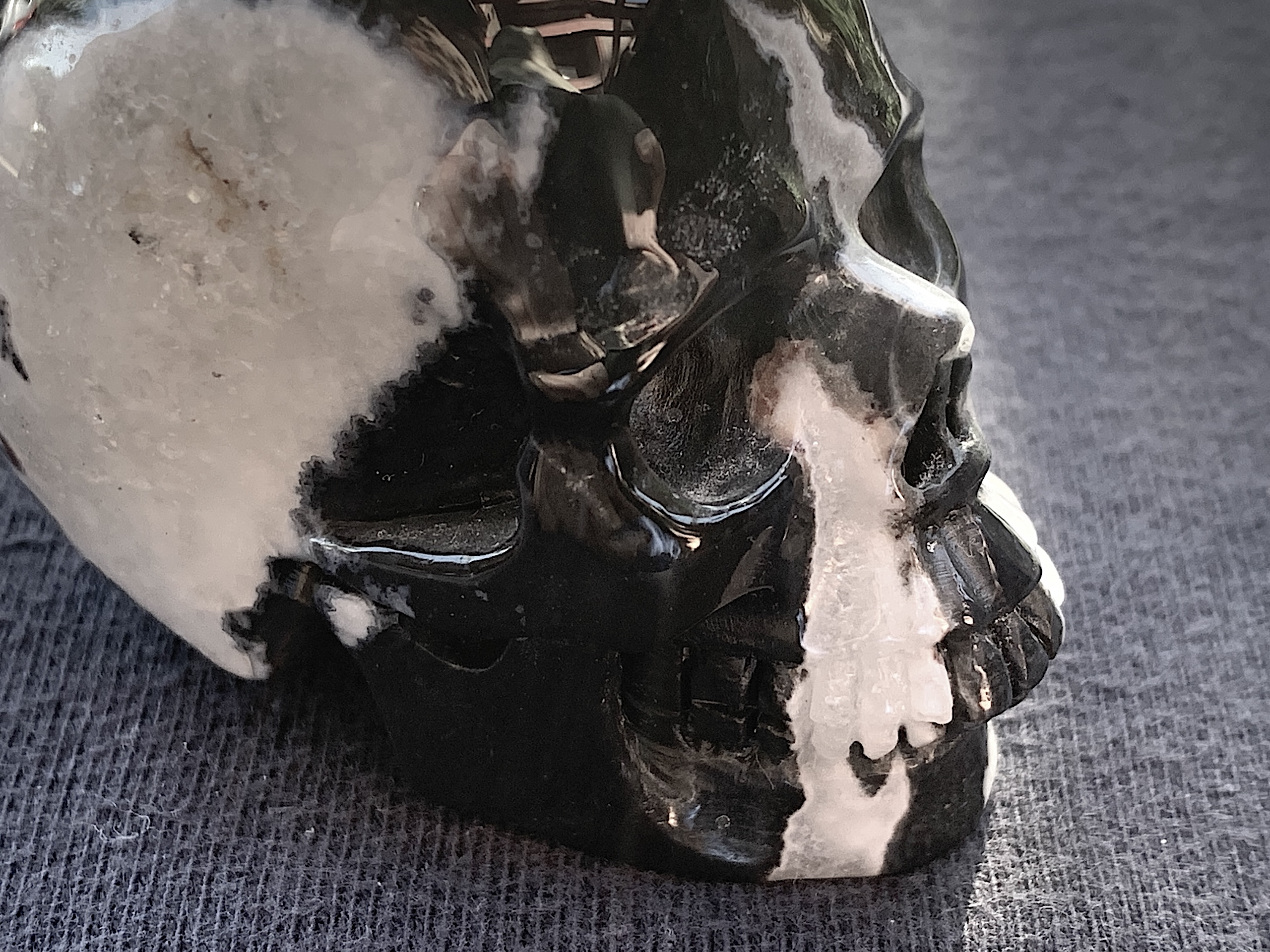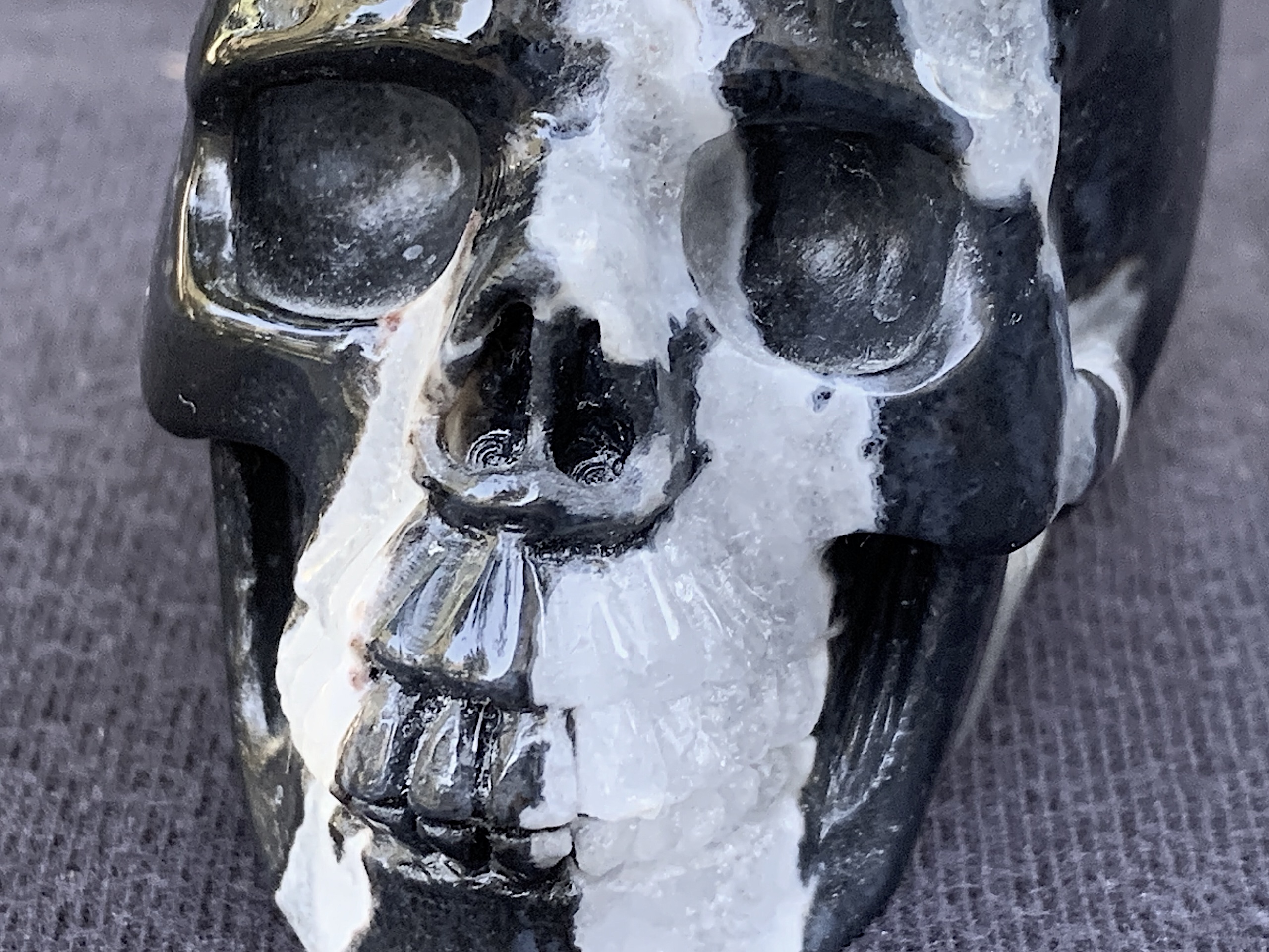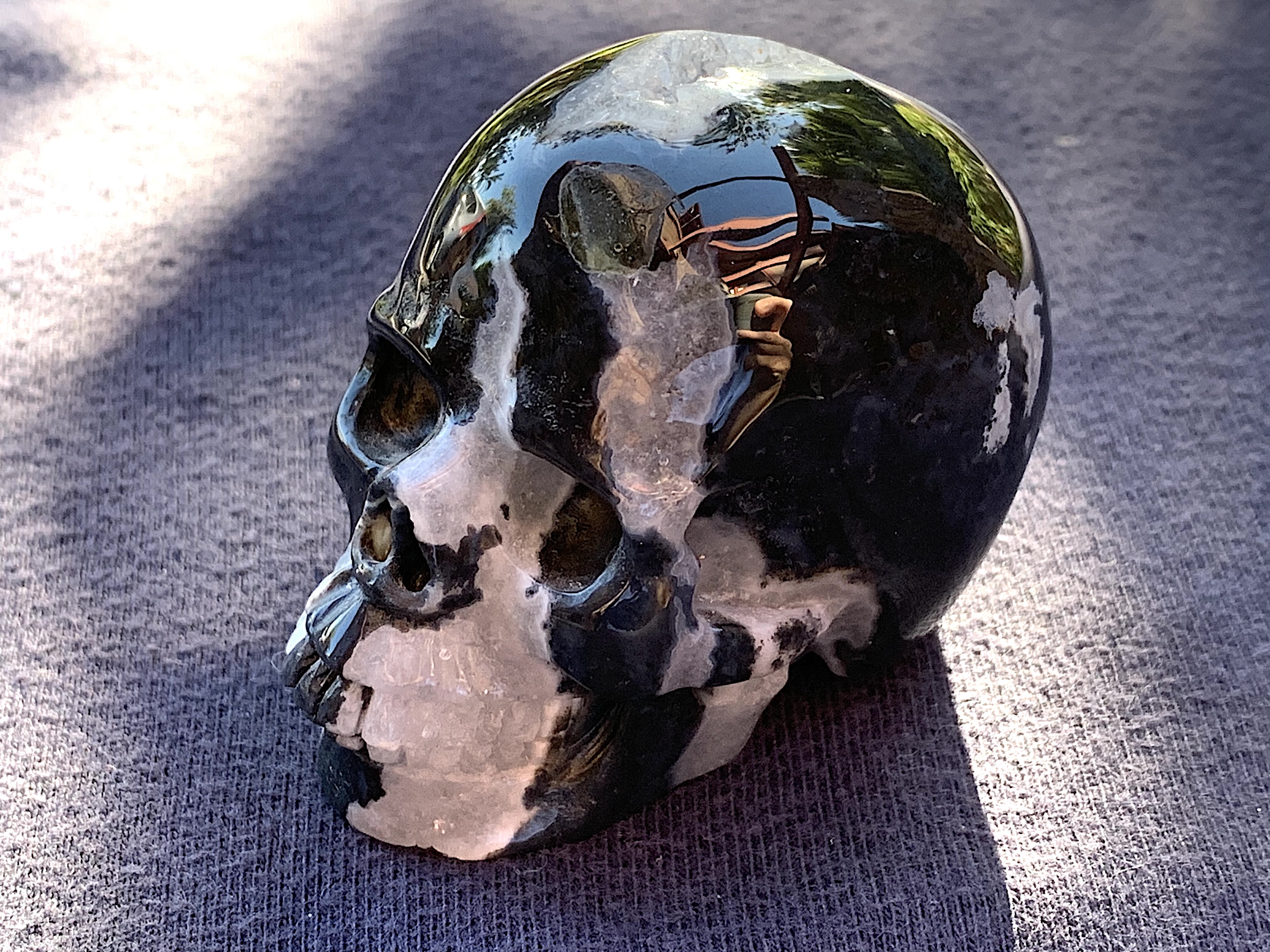 This Zebra Agate Geode Crystal Skull is so adorable. If you love Zebra Agate, this one will not disappoint. The geode on top of the head is very whimsical.